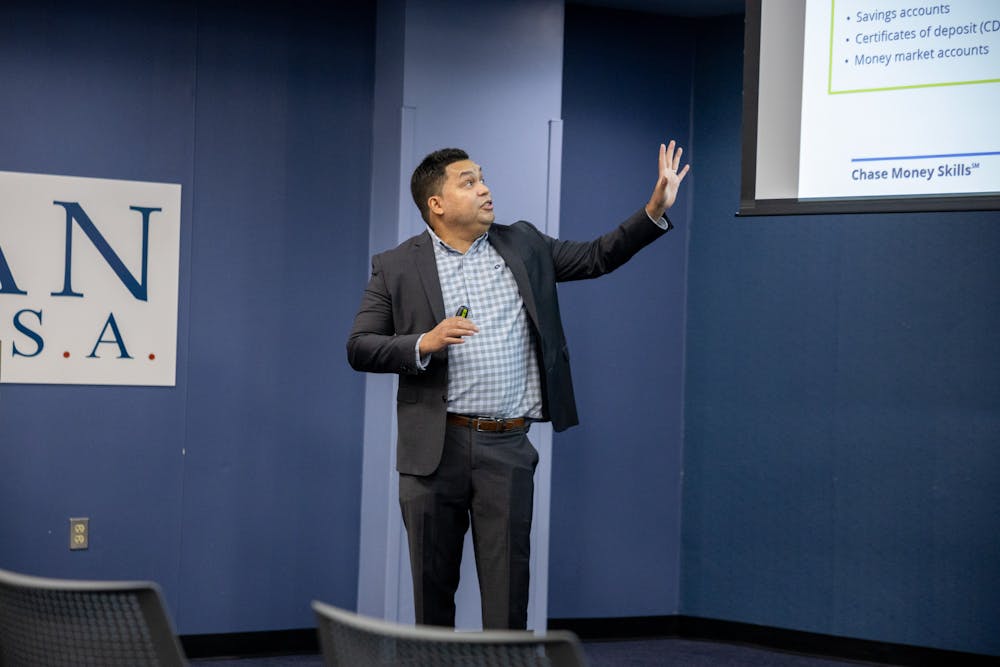 Throughout the session, Paez broke down the basics of opening and managing accounts, explained the differences between checking and savings, shared the importance of FDIC and credit union insurance protections, and cautioned about the hidden fees that can catch students off guard.