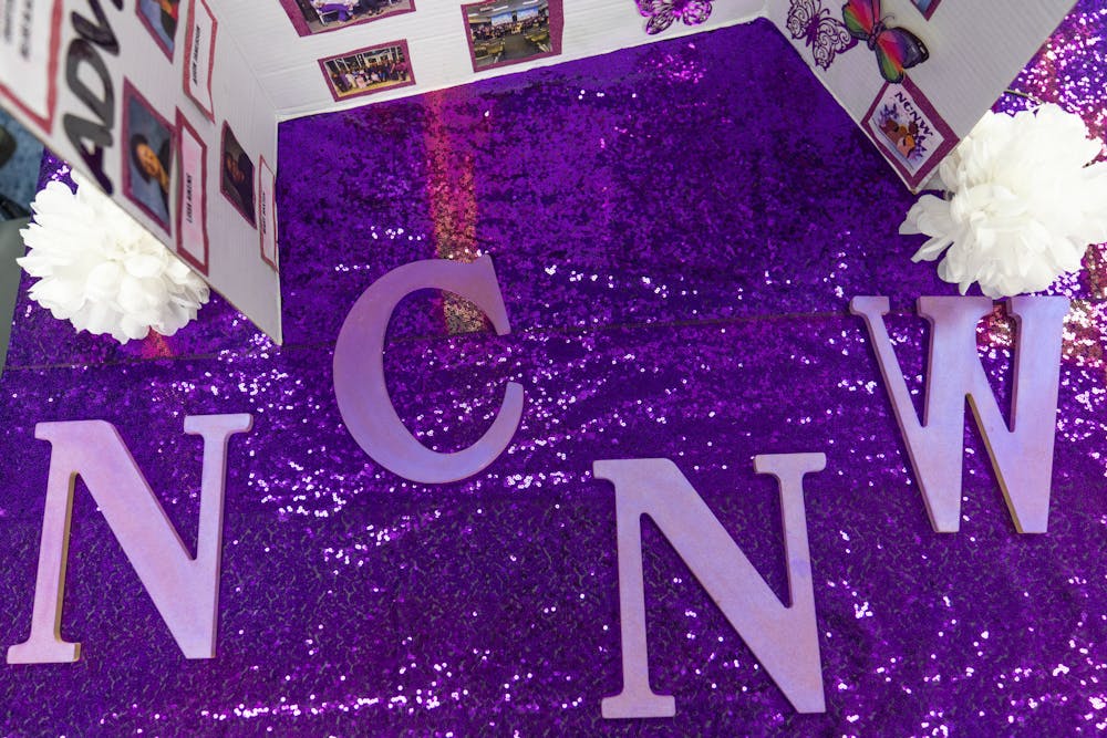The table, covered in deep purple tablecloth, decorated with NCNW paraphernalia, and lined with an array of orange juice bottles and a colorful informational poster, sported dozens of neat hygiene bags that passing students were able to pack and personalize with handwritten messages.